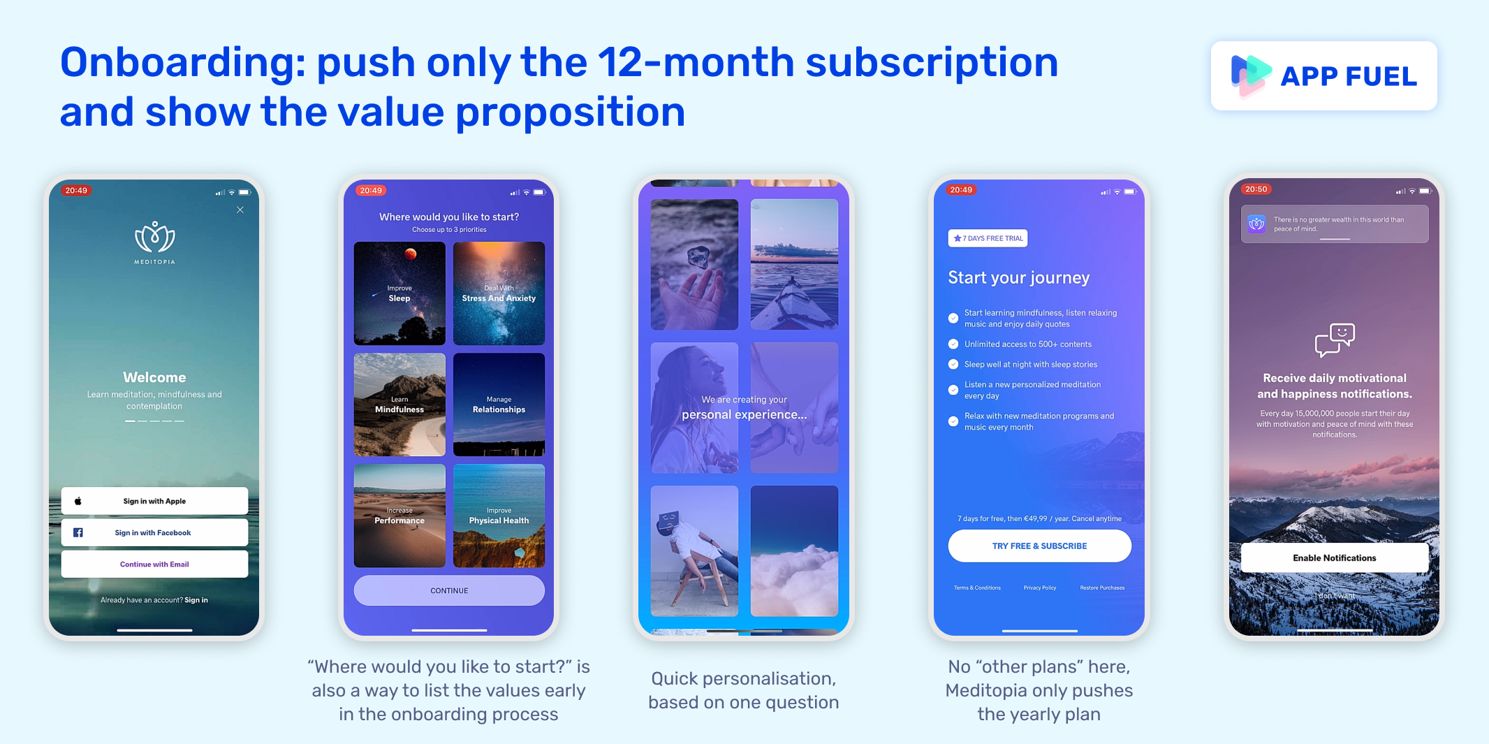 - Minimal onboarding with early interstitial for a free trial: show the value proposition and push the 12-month subscription. After signin up, the user is invited to answer the question "Where would you like to start?". This question allows a bit of personalization, but it is above all a way to list the value of the app early. It gives the impression of abundance and comprehensiveness of the app. Second, Meditopia has decided to push only the yearly premium plan in the onboarding, whereas other plans are available later on in the app.