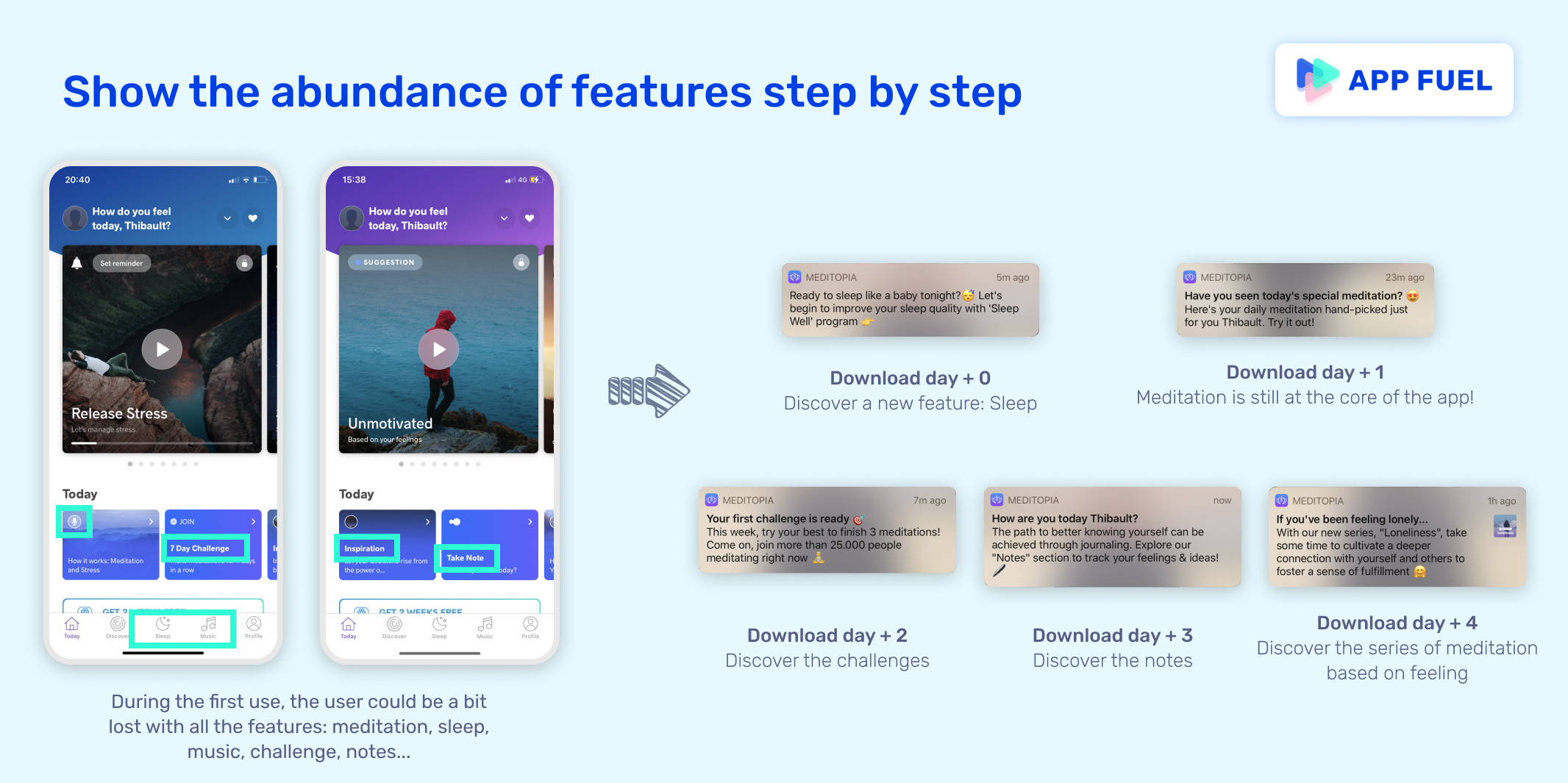 - Show the abundance of features step by step. The app can appear to be overwhelming when used for the first time. Meditopia has a smart notification process to enable the user to discover features on the go: Sleep, Meditation, Challenges, Notes, etc.