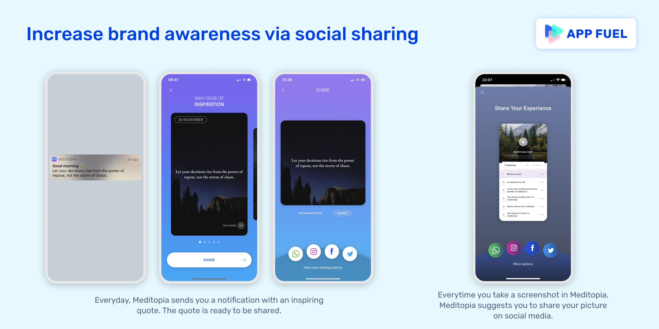 - Increase brand awareness via social sharing. Meditopia has introduced features to make social sharing easier, especially via daily notifications. Everyday, Meditopia sends a notification with an inspiring quote that is ready to be shared.