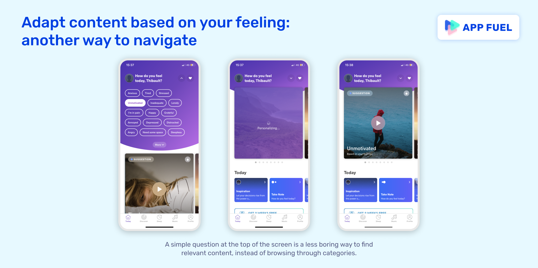 - Navigation through questions. A simple question at the top of the screen is a less boring and way to find relevant content, instead of browsing through categories. Meditopia asks you how you feel, and displays content based on your answer.