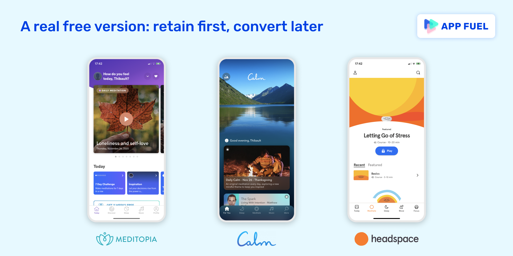 - A real free version: retain first, convert later. Unlike competitors, Meditopia showcases free content on every first screen when the user opens the app. In doing so, Meditopia bets that frustration is not the only way to make users go premium. Recurring usage and stickiness can do it too. Free users on Calm and Headspace feel like they cannot use the free version on the long term.
