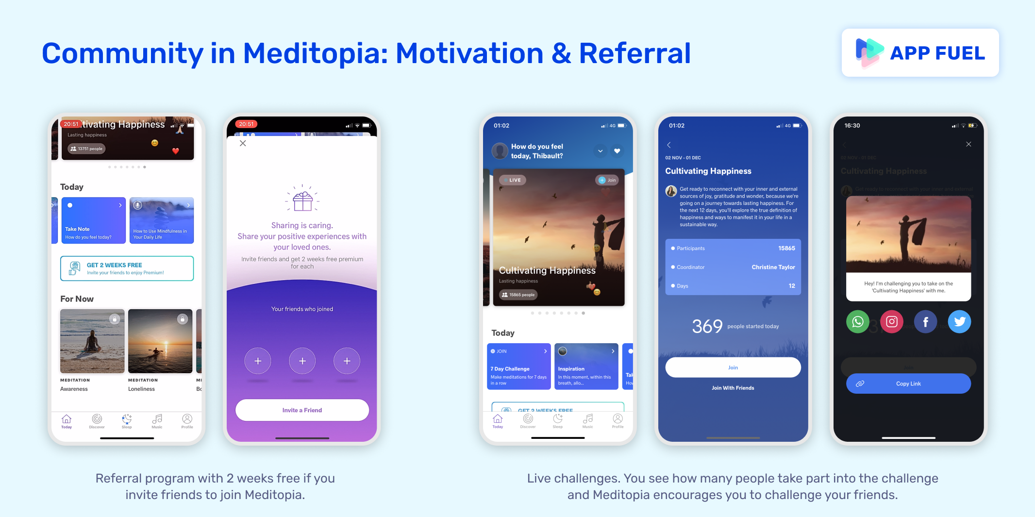 - Sense of community in Meditopia. Meditopia insists a lot on community and friends. It's a win-win strategy: it means higher motivation for the user and more users for Meditopia. The growth of the community relies on several tricks, including a classic referral program and social features like inviting friends to take part in challenges.