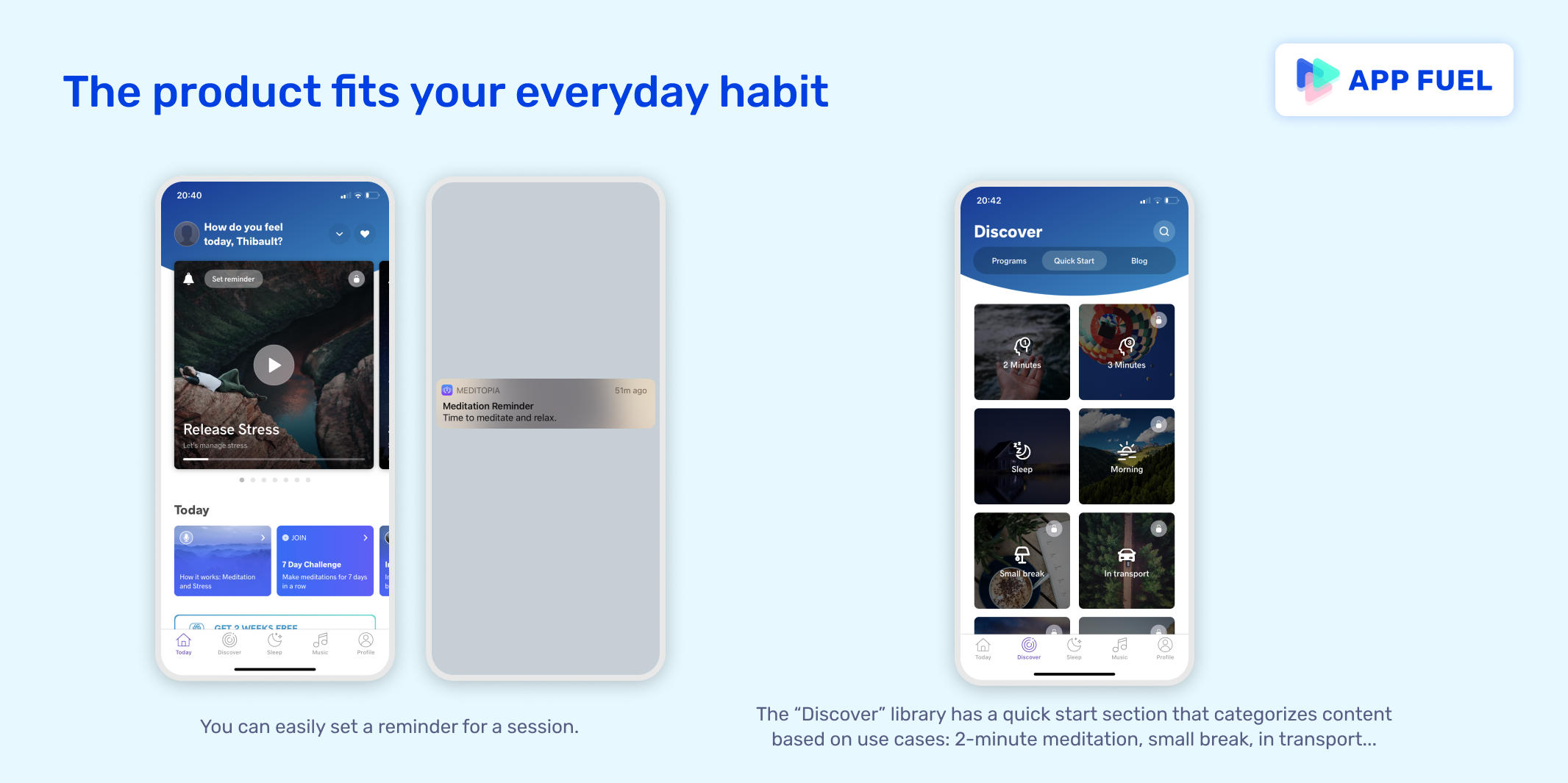 - Product fits your everyday habit: Features like the reminder or the situation-based sessions are good examples of how Meditopia tries to make you feel like the app can be used at the most appropriate moment for them.